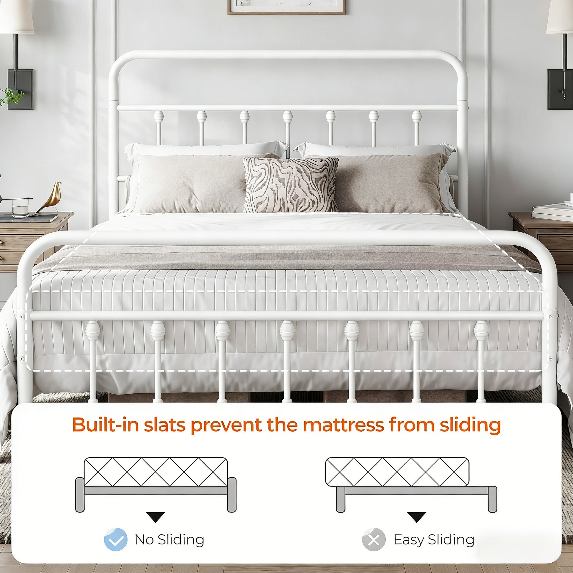 • No Sliding Mattress: Integrated slats keep your mattress securely in place.